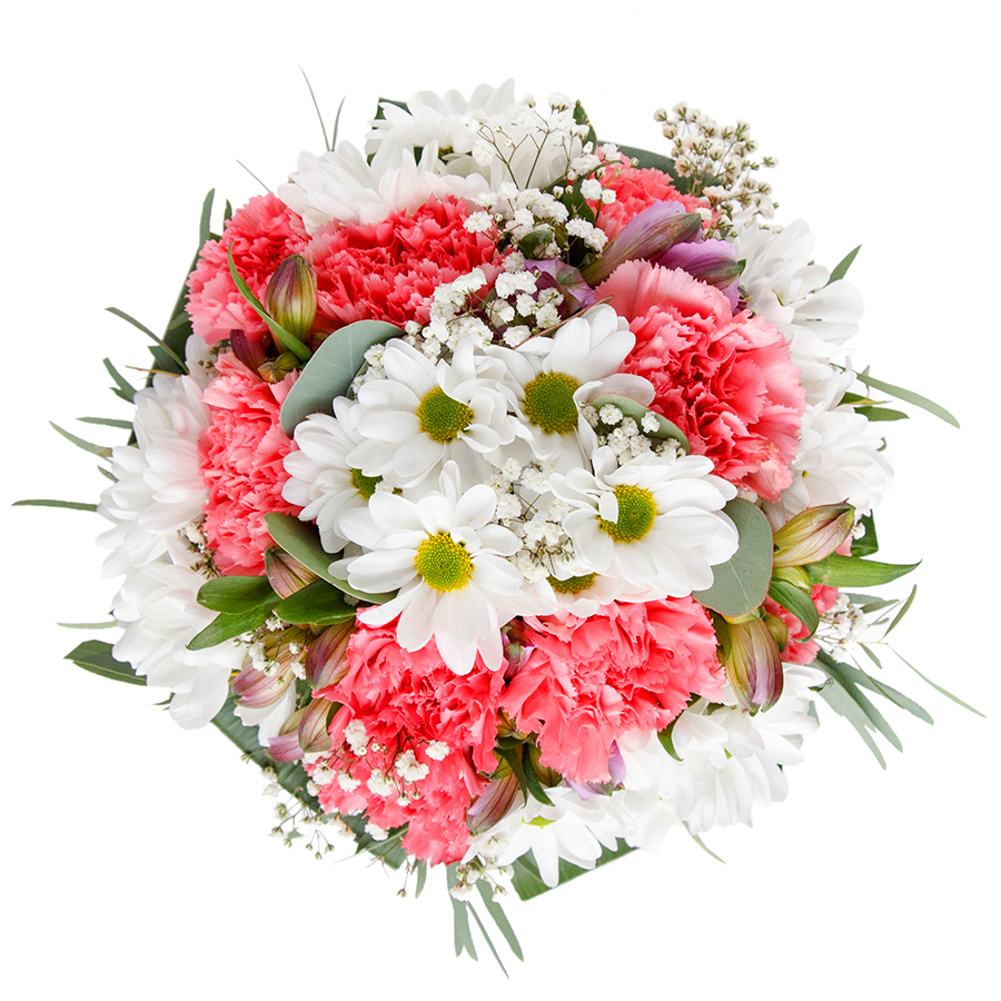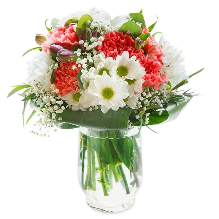 Experience a harmonious blend of art and nature with our uniquely crafted floral arrangement. This beautiful bouquet features a graceful medley of snow-white chrysanthemums, airy gypsophila, and delicate light pink carnations, accentuated by lush aspidistra leaves.